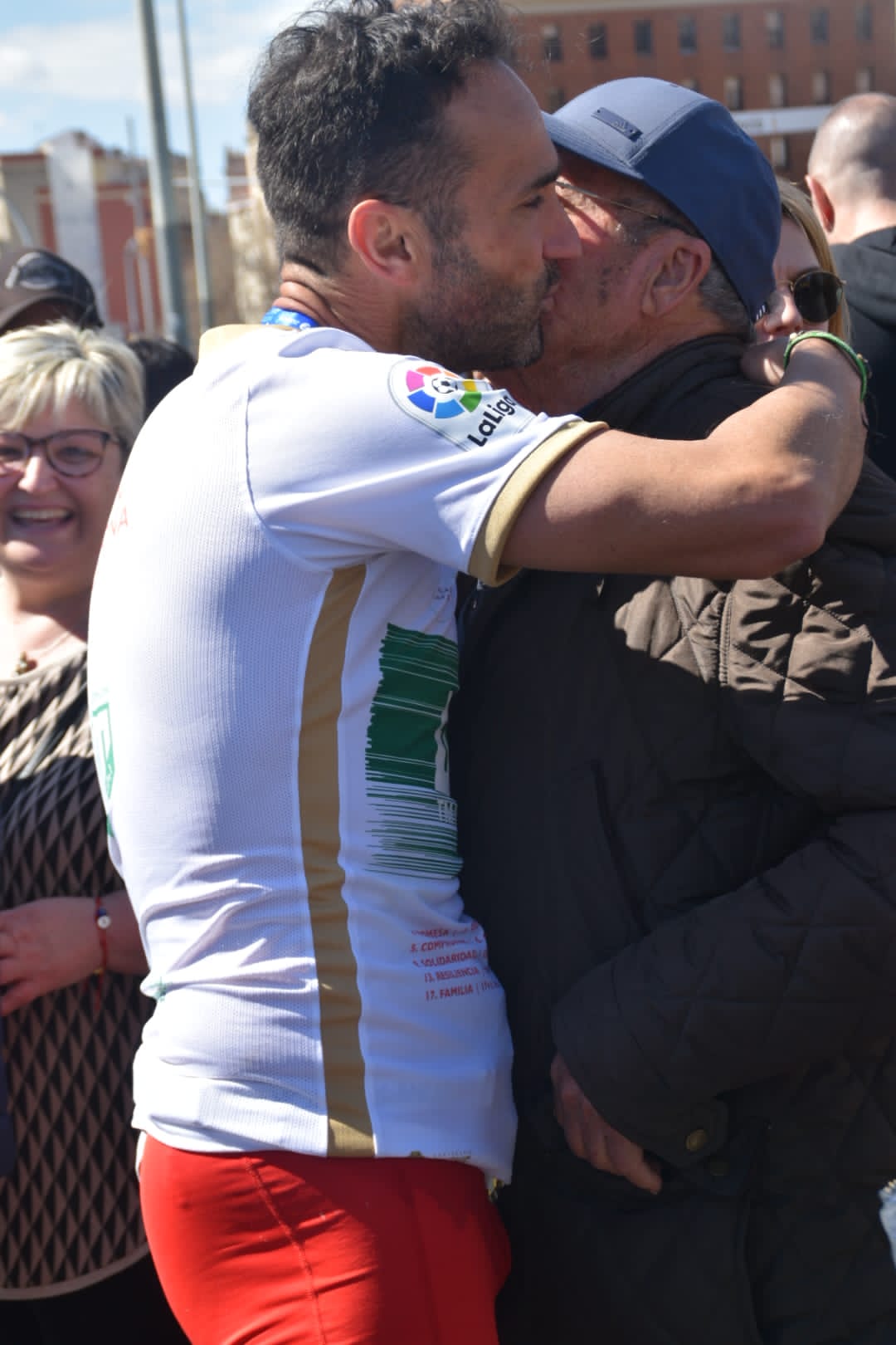 Me preocupa mucho que las personas que vienen a la maratón estén cómodas, fue un acierto que el Hotel estuviera cerca de la salida. Les dio tiempo a desayunar y a las 9:10 cuando Paco y yo pasamos por el km 9 ya estaba allí esperando para animarnos. Después de terminar nuestra maratón, fuimos todos a ver a Luis en el Km 41 y fue muy bonito y emocionante ver como Luis corría unos metros con Luis, Carmen y Teresa, sus hijos.